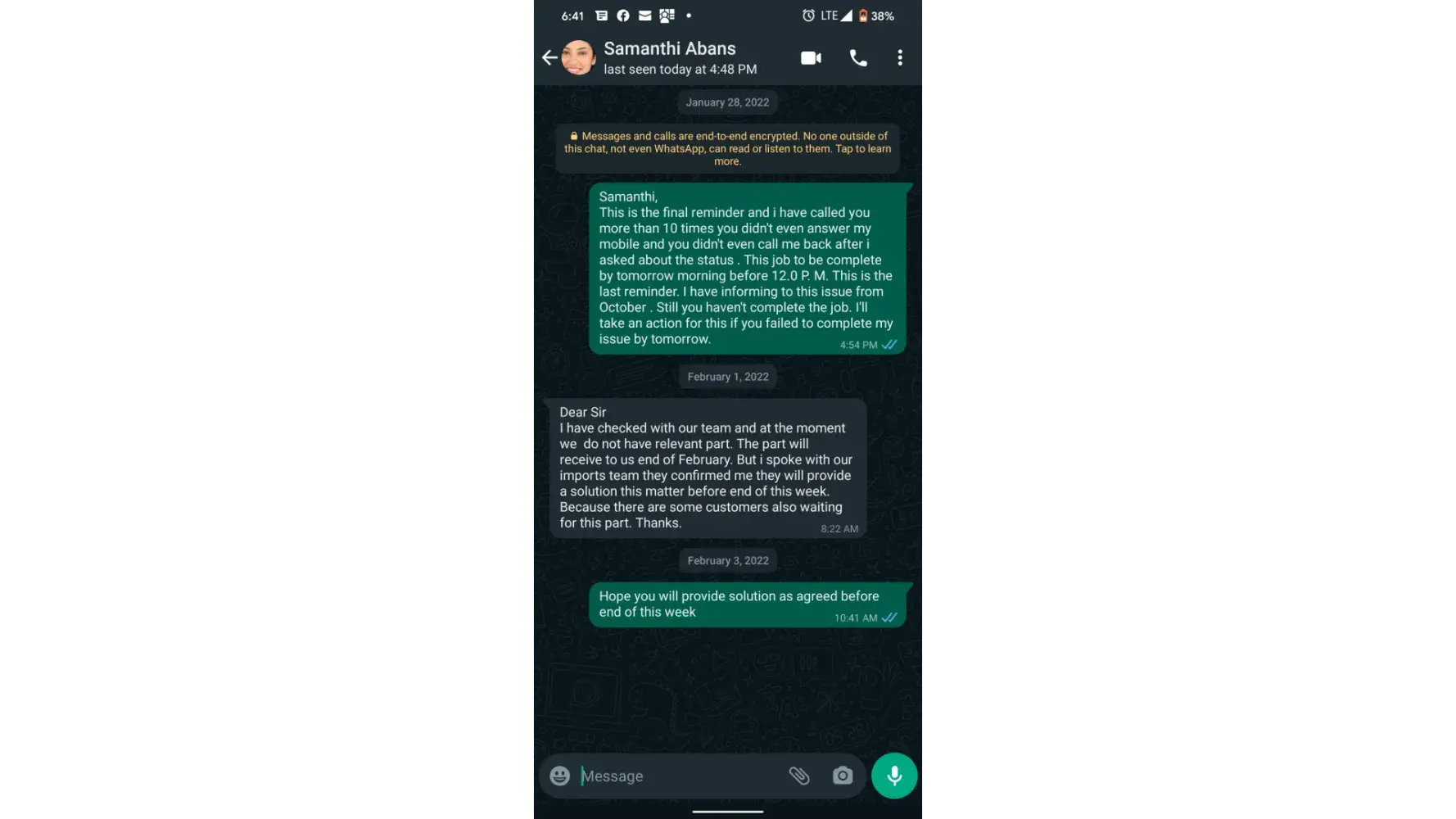 This morning when I called, it was the same story, exacerbated, I asked to speak to someone of authority, I was connected to the Manager - Ms. Rasha of the Contact Centre, who after listening to my entire complaint, said she had no direct contact with the technical team and was unable to give me a definitive answer as to when they will get in touch with me to visit my place to take care of the job complaint.