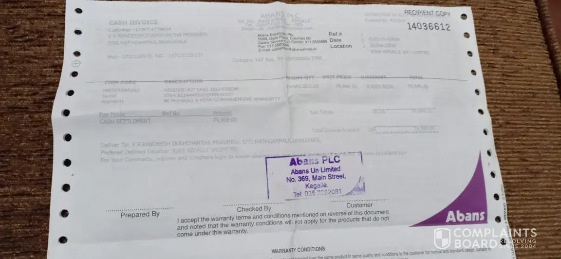 . It as TV panels can not be replaced, If replace cost would be more than the value of new TV and suggested to buy new TV with 10% discount. Then I call the call center of Abans company in Colombo and told this problem.