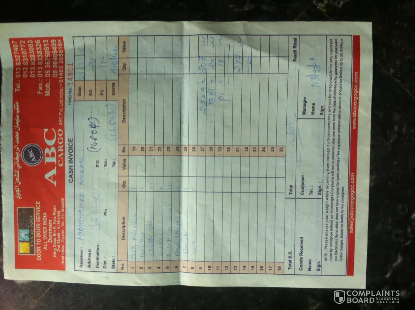 My self shakilur rahman despatched 13 boxes cargo through abc cargo al jubail k.s.a to new delhi in the month of june 2015 in 3 trips. already 16 months have passed but still i did not received a single box. details as follows.