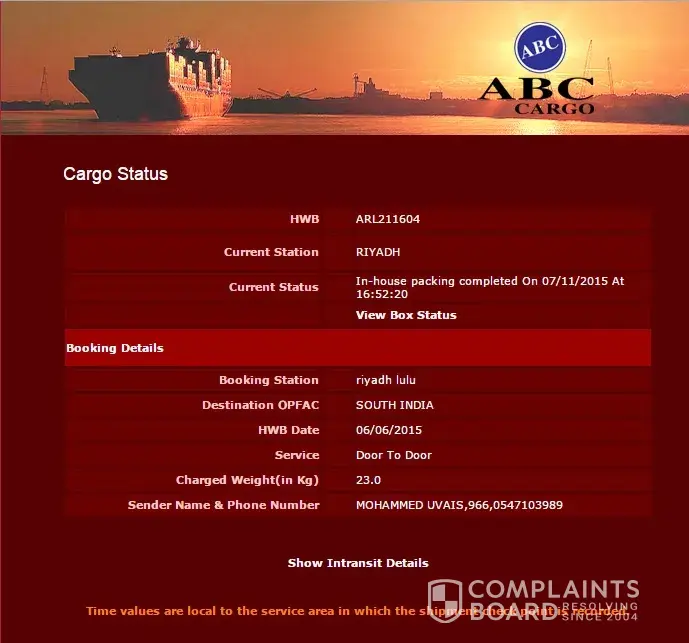 I made contact more than 100 times, every times they replied I will get within 15 days, already 8 months are going to pass and their reply still 15 days. This is my second time complaint, earlier I raised complaint in november, but I did not got any response. Now their mobile and phone also stopped working. No response from their side. I will take legal action against abc cargo if I do not receive my cargo. I request you please reply to my given e-mail address ([protected]@hotmail.com) or mobile no,