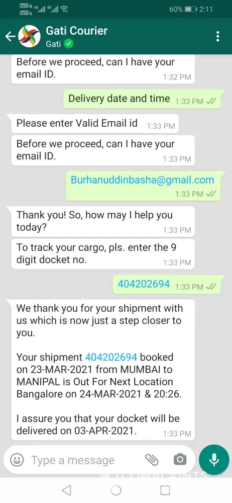 As per gati estimated delivery date 03 April 2021