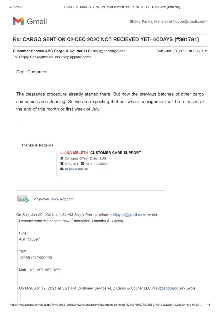 AFJT80937 - ABC Cargo poor customer service - 4 Months my consignment haven't reached to India