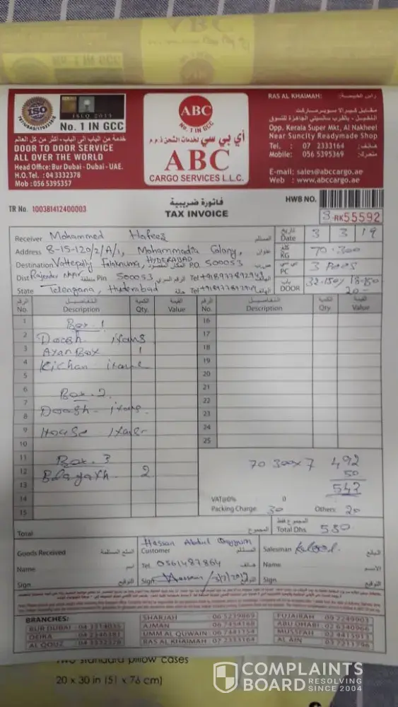 Number 1 : all the items sent from the UAE to India (Hyderabad) are broken, instead of Packing done by the ABC Cargo experts with an additional charges or separate packing charges are charged from the customer excluding the per weight charges.