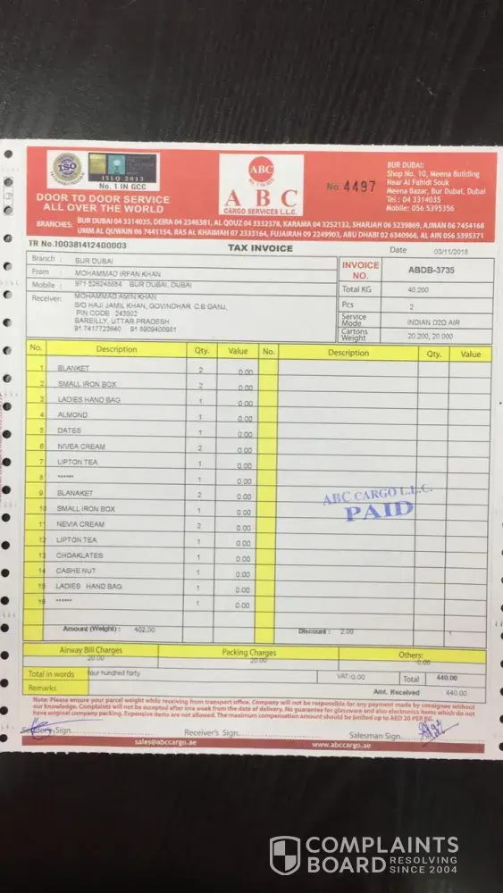Worst service ever. Don't choose the service from ABC cargo Dubai