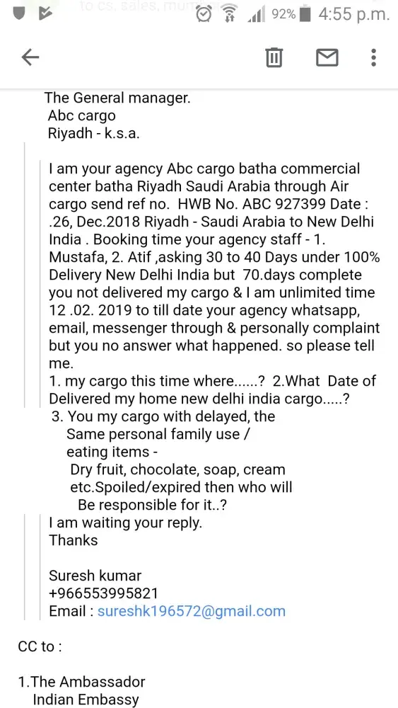 I am abc cargo batha commercial center, Riyadh Saudi Arabia to send air cargo Riyadh to Delhi India ref .No. HWB : ABC 927399 Date : 26, Dec.2018 consignment no. BOM 92. Air cargo sending time your staff telling 30 to 40 days under 100% delivered cargo new Delhi but today 72 days complete then my cargo not delivered. What happened...?
