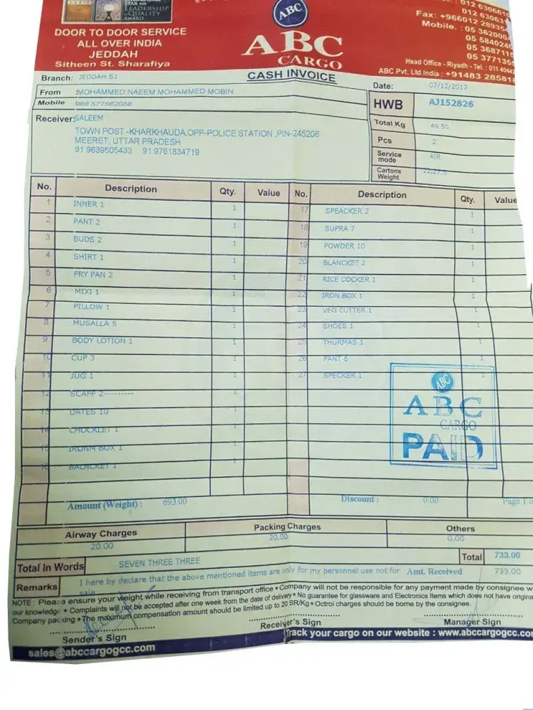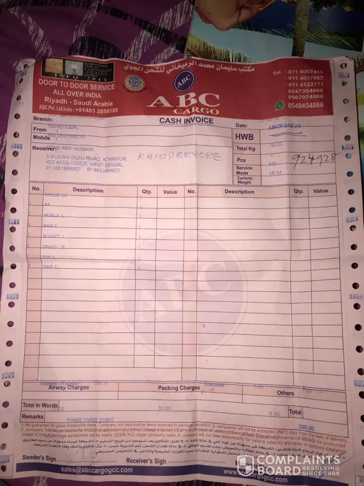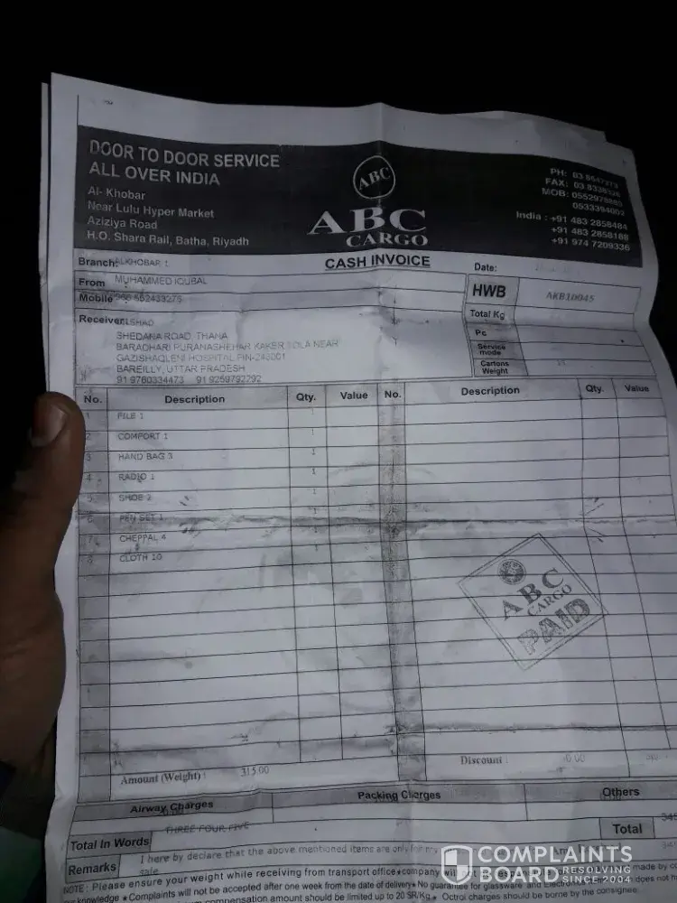 Sir my me send cargo by Abc cargo in Riyadh Saudi aarab shara rail baths date 24/08/2015 my bill no A256064 total kg 65.50 but no received in India Rajasthan so sir please solw my problems thanks