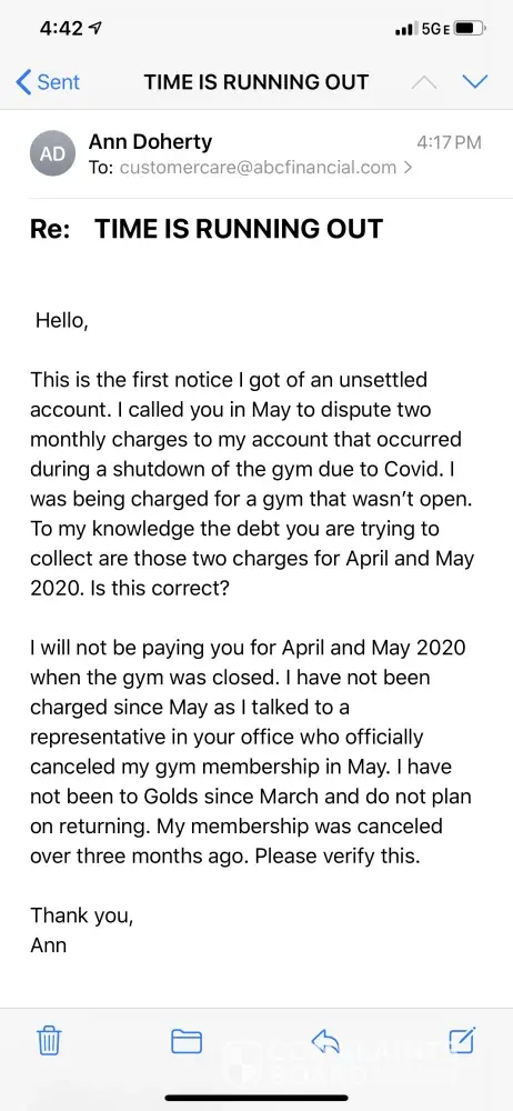 I then received an email from ABC financial stating that my membership was behind and needed to pay. I called them and explained to them what was going on. They are trying to tell me that when I called to cancel, that I really didn't cancel (or that was their understanding?). I said that's a bunch of crazy and went over all my texts, calls, etc. How would a sane person think that I didn't want to cancel when I called in to cancel in the first place?