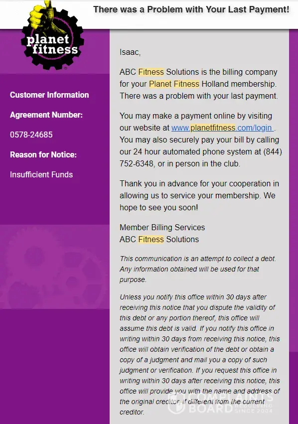 ABC Financial Services Golds gym membership billing card on file, incorrect.