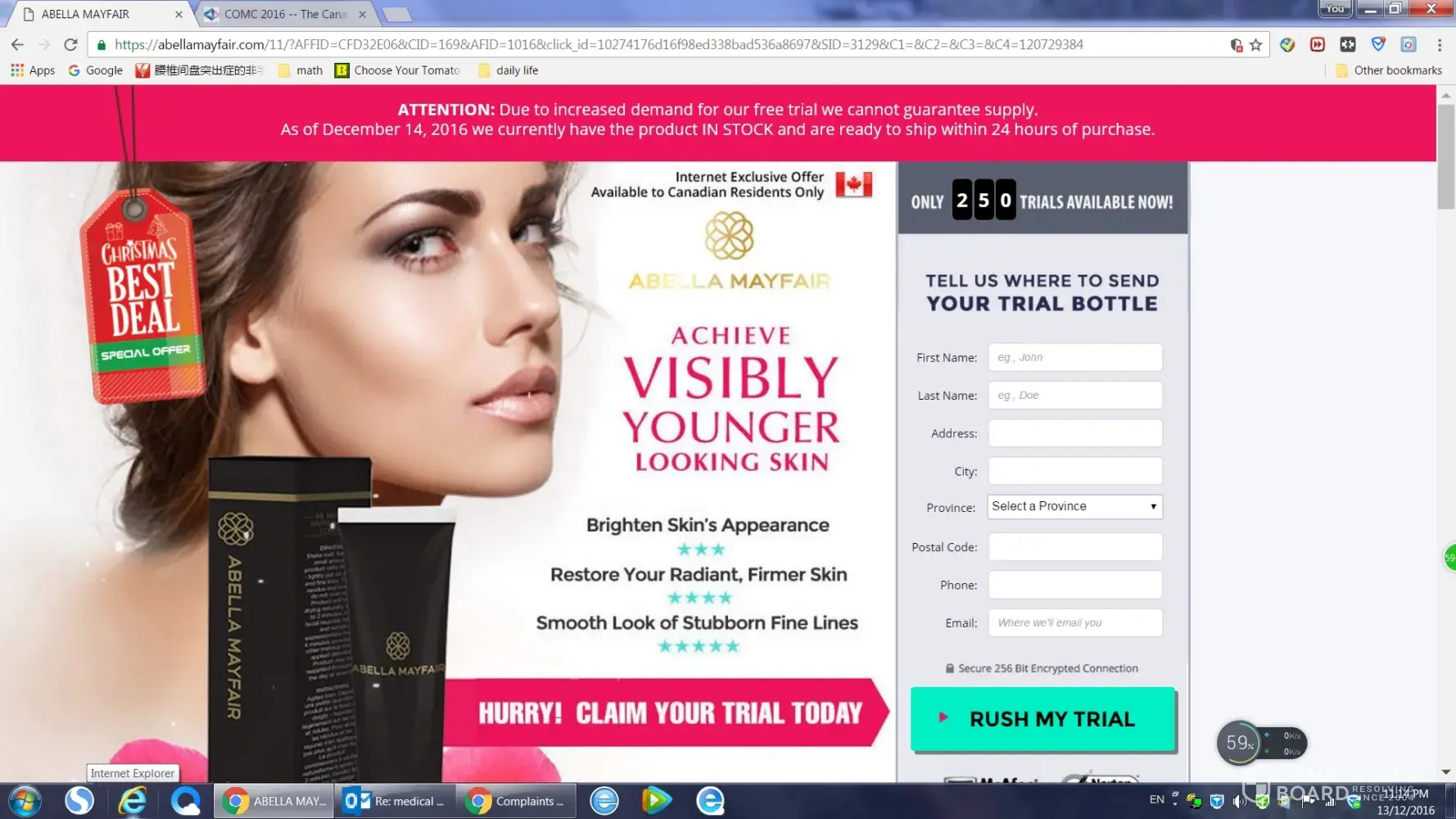I live in the Comox Valley and the above scam happened to me as well! I cannot believe this... Was asked to pay for shipping of $ 5.95. for free sample. I was a bit skeptical as when I purchased it took me through a whole bunch of pages with different offers, which I clicked NO. I was so shocked when my Credit Card bill arrived. 1 charge of $ 5.42, another one of $ 6.80, then another one of $ 155.04, and another of $ 138.64 and $ 119.04 on my next bill, that is still coming, also I have another charge on my bill, something that I did not order for the amount of $ 64.51. Capital One mentioned, that it might be from same company, just under different name. When I phoned Capital One to ask, whether they can stop payments on whatever is going on here, these are things I did not order. They were not able to help me, except issue me a new card and cancel the old one immediately... I have not had an income for 3.5 years. This is devastating to me. Contacted the company and of course they said I did not read the terms of condition. I was adamant, that the only thing I signed up for was the $ 5.95. I was told, that I had two weeks to return the product or cancel my order, which was a 0, 5 oz of some tiny tube and a 1 oz. cream. I cannot believe this is happening to me, and by the looks of it other people. The credit card company was not able to help me. and the company is impossible to deal with, well it's a scam.. Unbelievable! I really cannot believe this has happened to me. where does one turn to to complain? The RCMP? How do we as consumers protect ourselves? I do remember the saying: LET THE BUYER BEWARE. I guess joke is on me this time around...UNBELIEVABLE!