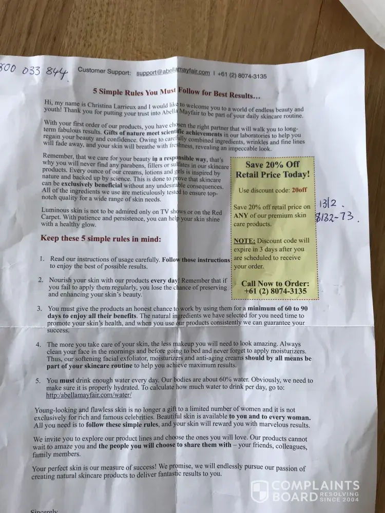 I saw this add on facebook which state pay for postage and will send a free sample of our eye serum. I did not received samples in December and then in January I received eye serum and face cream. I looked up my credit card statement and then saw that they had charged me $118.09 & $131.21 plus postage so I thought that was the end of that. Then yesterday I received another eye serum that I did not order so I quickly looked up my credit card statement and this time they charged $137. I complained to the company and they state that I agreed to this as I did not. Their web site and terms of conditions are so so sketchy that they have scammed us all. These products have given me severe migraines and god knows what is in them. I have the bank looking into this matter now. I am from Australia and I warn everyone on facebook/instagram not to get sucked in by this company. They said they would give me $100 credit if I say YES, I agree but to what, I will never agree to shifty business on the internet ever again. Person in charge: Christina Larrieux.