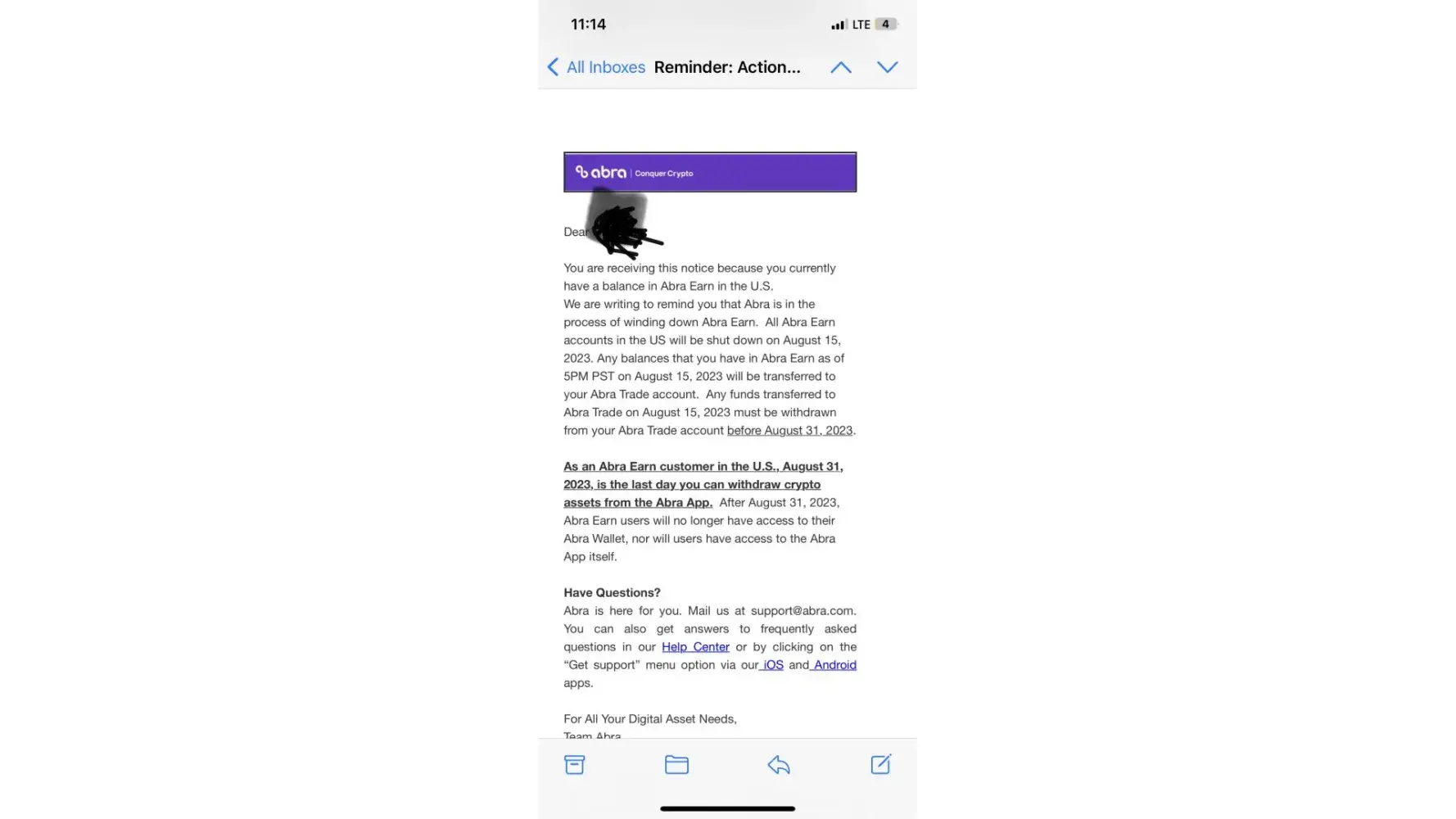 “This is the Abra Support Team, and this is a follow-up to our previous email. Based on our internal requirements, we will be restricting your wallet, and you will not be able to do bank or credit card transactions using the wallet(s). If you choose, you may still deposit BTC but you will not be able to deposit or withdraw using a bank account or credit card.