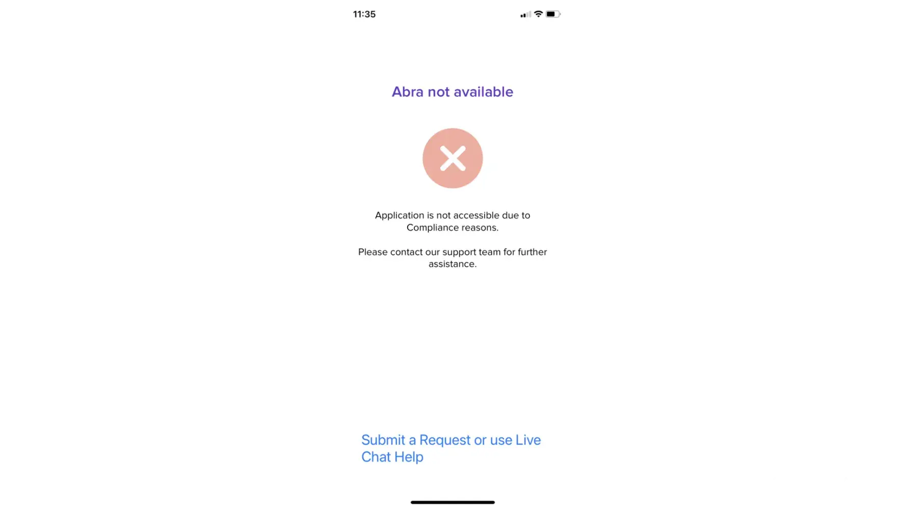 Abra app won't open. I have Bitcoin on this platform since 2017. I have been earning BTC interest for a couple of years. At end of July, 2023 I got a message from Abra that interest had been added to my account. On August 16, 2023 I tried to open Abra app and got a message "app will not open due to comliance issues"