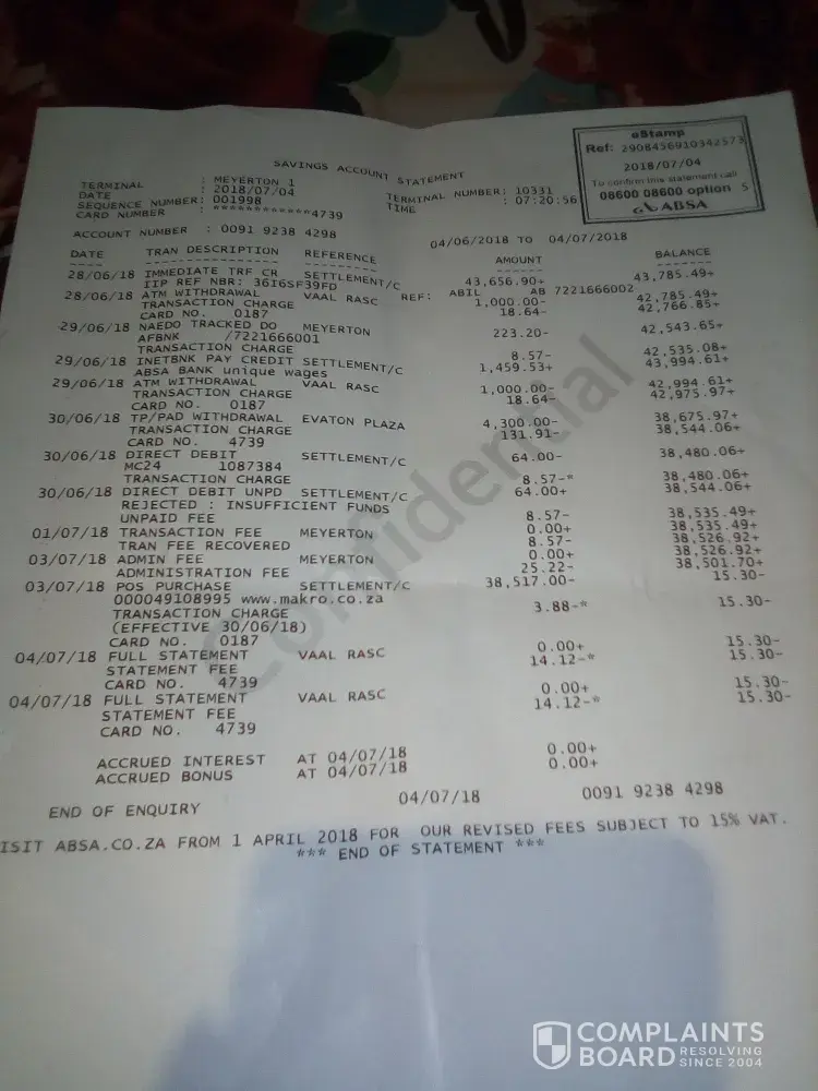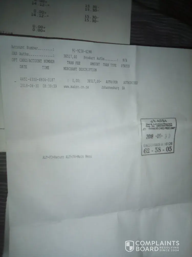 In June 2018 my brother borrowed money from African Bank and it was approved and paid on the 28th June 2018 to the total amount of 43, 656.90, within a period of 2 days he withdrew R2000, on the 30th of June he went to ABSA Evaton Plaza to withdraw an amount to the value of R10, 000 To my suprise he says the guy who assisted him asked him what he was doing with such a huge amount of money and he says he answered that he has his own reasons for that money, he then checked his account and immediately said there are insufficient funds in his account, there is only R4, 300 available he asked him if he really needs the money then my brother said yes, he assisted him and made a withdrawal of R4, 300 thereafter he immediately referred him to this other guy who will assist him further who took my brother's card cut it into pieces and destroyed it without even explaining why, he only said this card is no longer working and provided him with a case number and told him they will investigate the matter and call him, they gave him an A4 paper with an ABSA stamp which shows where the alleged withdrawal was made... "but to my surprise on the statement that I have now the money was still in the bank then", then he went back to the initial consultant who gave him his R4, 300 and he left, even today they haven't called him or anything, when he tried to call your head office he realised his cell number was discontinued and he couldn't make any calls, he tried to do a Sim Swop and was told the number was unknown yet he has been using this number forever in his life even as his only contact number in ABSA, so meaning those ABSA guys are geniuses they discontinue the number so that he couldn't have any in contact service with the bank.So my brother is not literate so they took advantage of him, the other surprising thing is that 6 days after he went to the bank the money which was alleged missing is being spent at Makro with the total amount of R38, 517.00 I have a copy here for the alleged purchase made at Makro, I need you to investigate this immediately and ensure that my brother gets his money, this is a loan that he has to repay back, if no action is being taken against these thugs we will be forced to go to the last Media platform in SA, I advised him not to go to the bank because it is clear that the illegal activities are happening in that branch and I suspect it is a syndicate, this guy wouldn't have a nerve to do such thing if he didn't have back-up of someone in Admin or superior, please investigate this and give him answers and his money ASAP, he is about to get a heart attack and I will keep this email as proof and the family will sue everyone involved including the bank.I have attached the alleged case number & bank statement from the day the money was deposited to him and when it was withdrawn/spent.