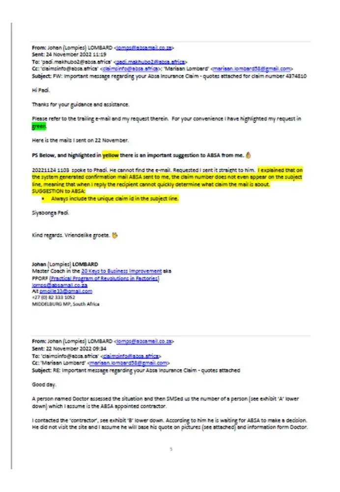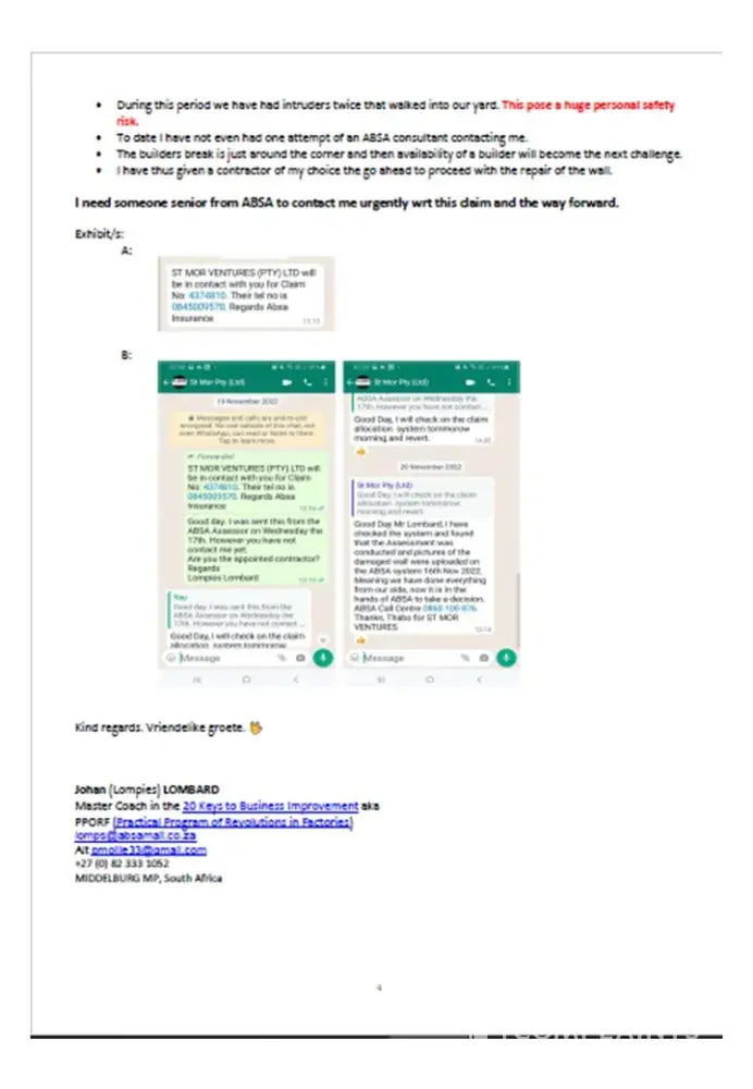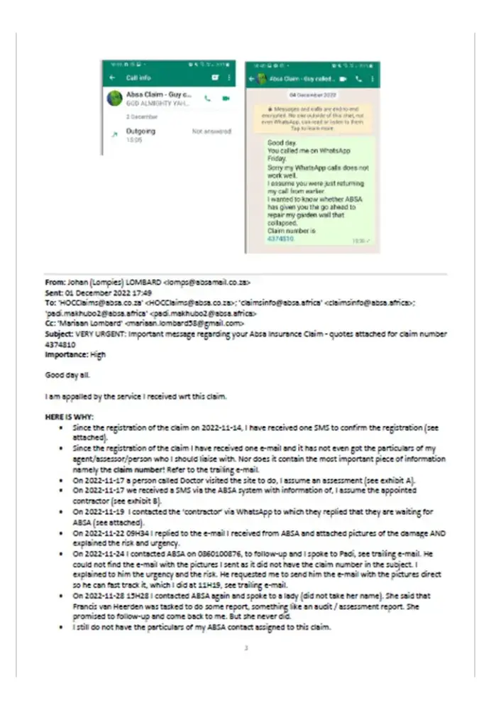 • On 2022-11-24 I contacted ABSA on [protected], to follow-up and I spoke to Padi, see trailing e-mail. He could not find the e-mail with the pictures I sent as it did not have the claim number in the subject. I explained to him the urgency and the risk. He requested me to send him the e-mail with the pictures direct so he can fast track it, which I did at 11H19, see trailing e-mail.