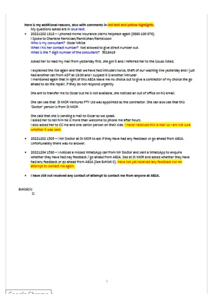 Desired outcome: Quick, fair and meaningful decision by ABSA Home Insurance.