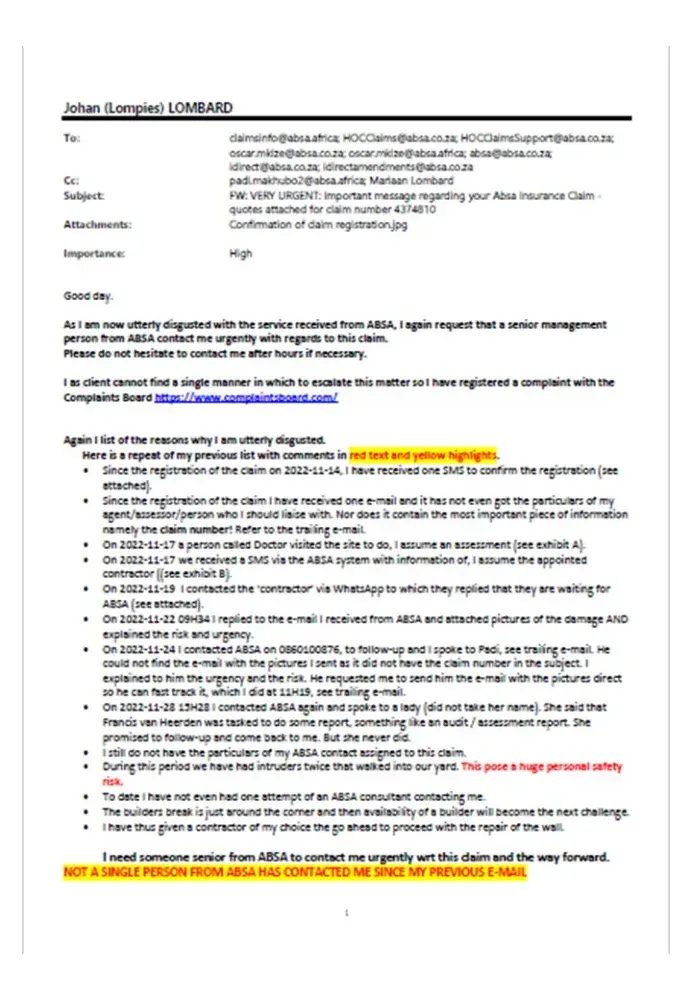 I need someone senior from ABSA to contact me urgently wrt this claim and the way forward. NOT A SINGLE PERSON FROM ABSA HAS CONTACTED ME SINCE MY PREVIOUS E-MAIL