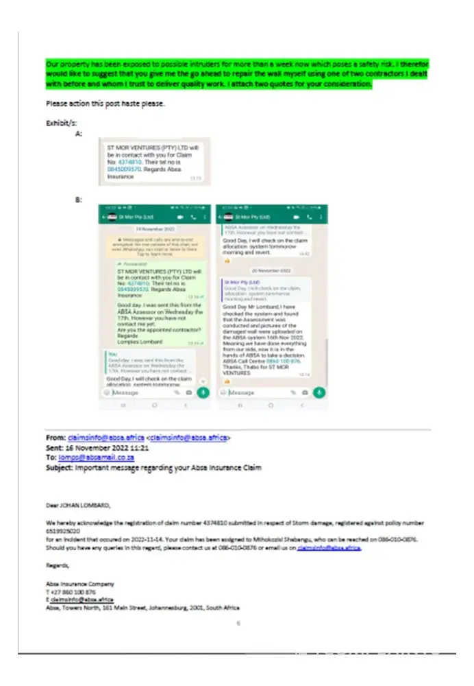 • On 2022-11-22 09H34 I replied to the e-mail I received from ABSA and attached pictures of the damage AND explained the risk and urgency.