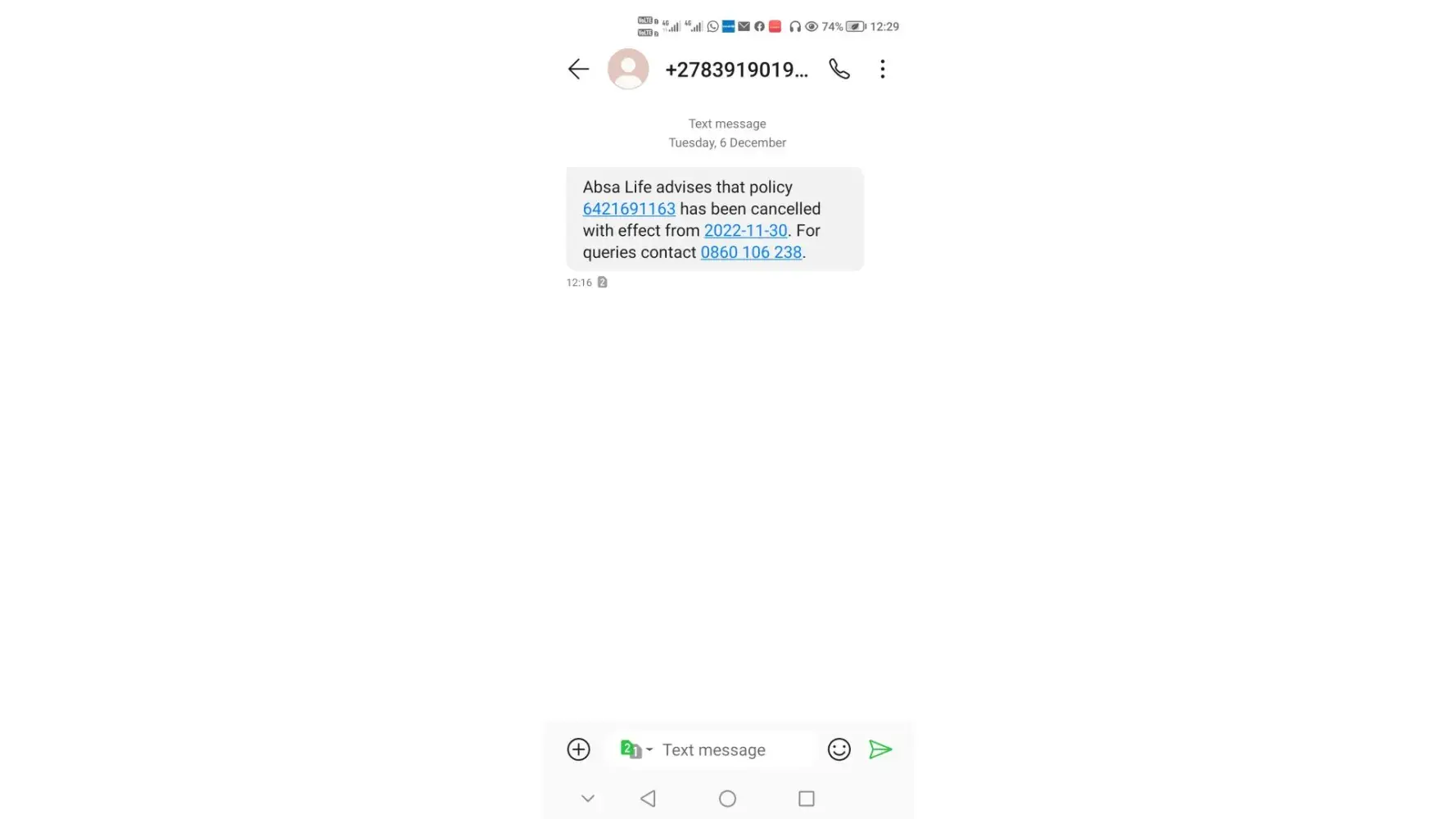 Then on the 6th of Dec 2022 I called Absa on [protected] for the cancellations of the two policies and to refund November deductions for both policies.