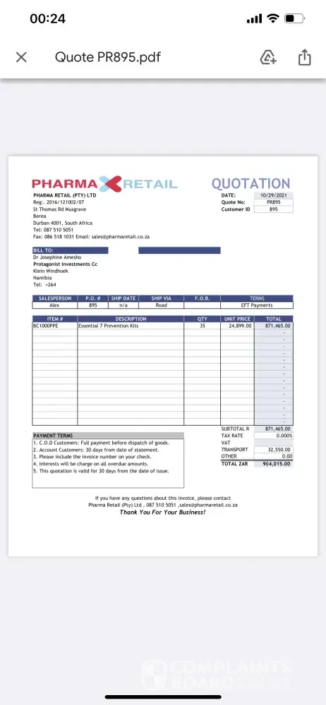 On 03 November 2021, I made payment into Pharm Retail account number : [protected], branch ABSA electronic settlement, branch code 632005 paid an amount of R 571807.95 for the supply of goods to Protagonist Investments CC in Namibia. After payment, I discovered that I was scammed. The contact person was Alex Khosa, a sales manager +[protected].