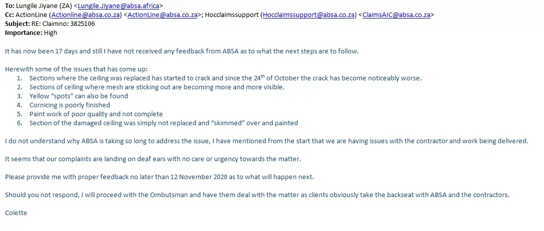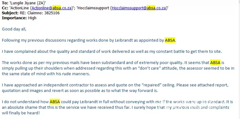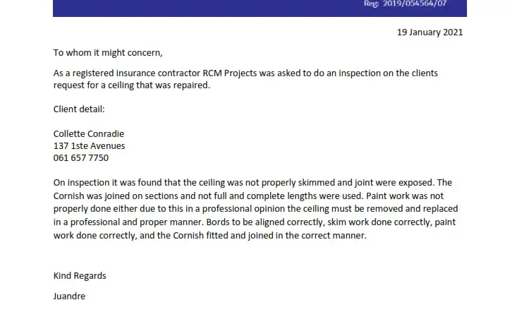 ABSA eventually sent out a assessor that claims the original ceiling is in a bad state. There is no original ceiling. The ceiling he referred to is the ceiling replaced by the contractor. That is how bad the quality of work is.