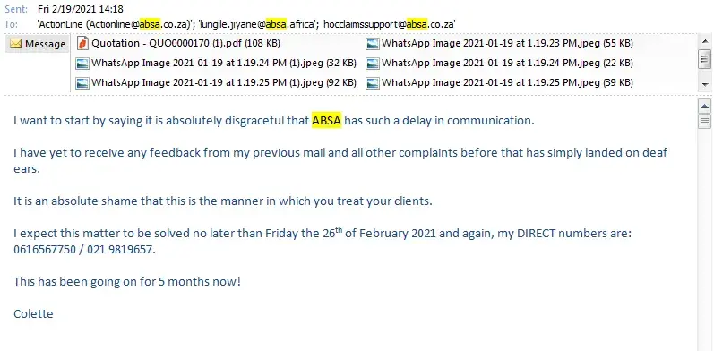 See below autoreply from ABSA on the 04.03.2021 & no response as of yet