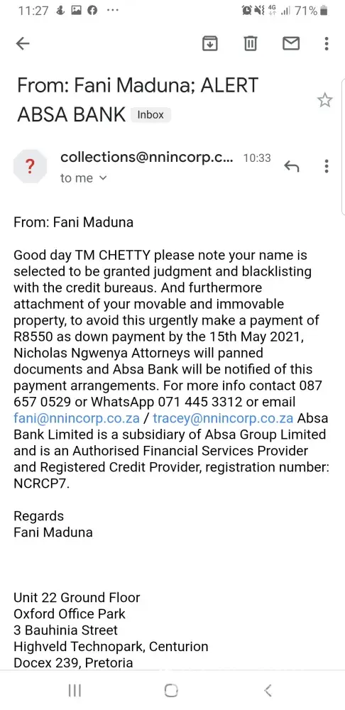 My name is Hemrajh Buldeo a South African citizen who lives in Centurion Gauteng. I have been retrenched in 2019 shortly thereafter I had a contract position for 4 months and I became unemployed. I have contacted ABSA head office to notify them of my unemployment and I have submitted all the necessary documents to them. I have applied for concession in terms of payment relief for my Mortgage bond, vehicle finance, credit card and personal loan. Yesterday I have received an e-mail from Crystal Stoffels ([protected]@aragroup.co.za) from Anthony Richards and Associates demanding a payment of R5106.00 for my personal loan which was only unpaid on 28th February 2021. This has been the first incident of non payment on my part because I have made arrangements with ABSA for reduced payment due to me being unemployed. I was expecting ABSA to revert to me with a minimum payment arrangement for the next 3 months but ABSA in their wisdom has handed me over to the above attorneys for just mission one instalment. I have been a client with ABSA for more than 30 years and this is the way they treat long serving clients? Please assist me resolve this matter because I feel this it unfair and unnecessary for ABSA to hand me over for collections when they are aware of my financial situation. Kindly contact me on [protected] or via e-mail to [protected]@yahoo.com