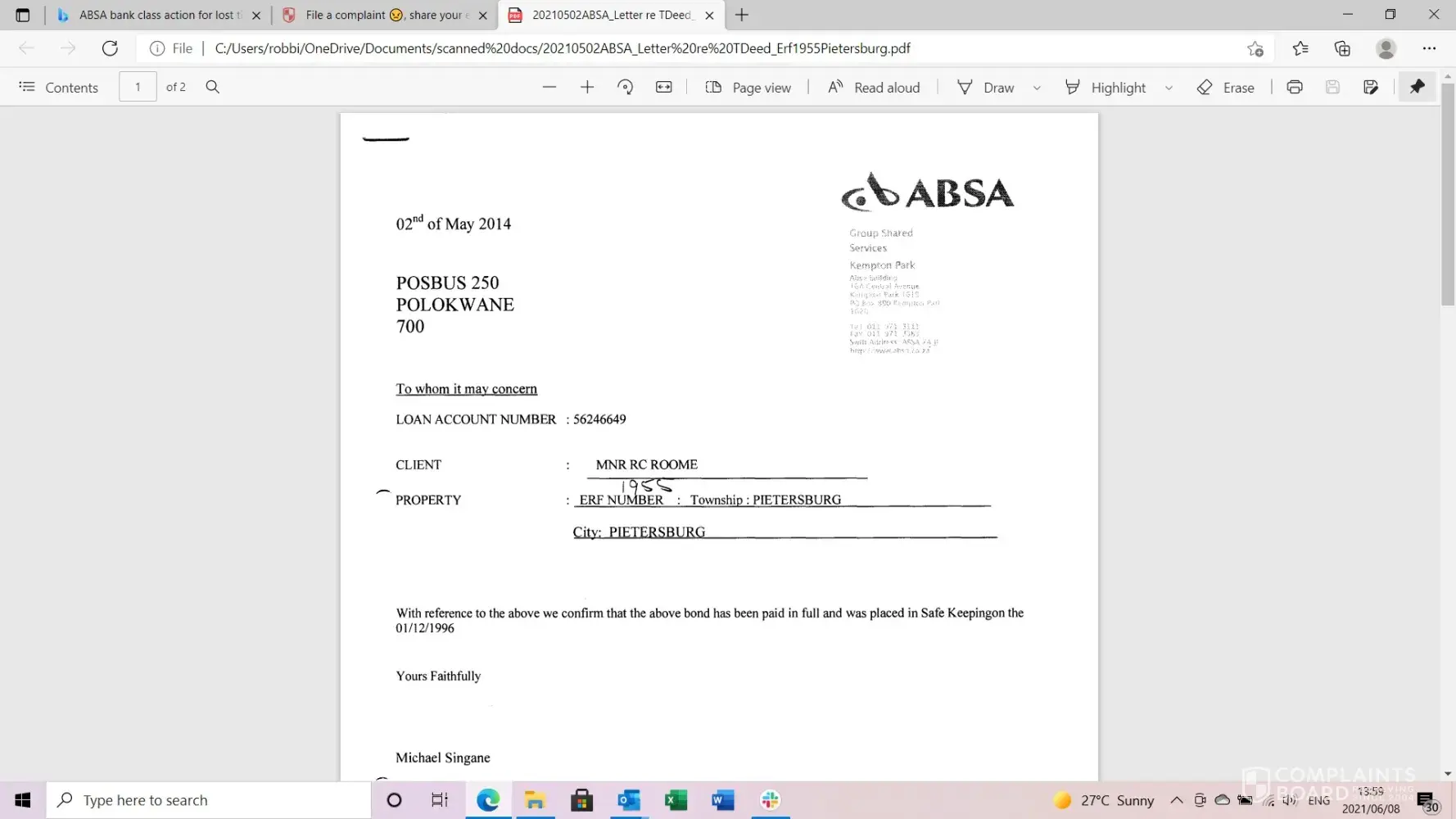 In May 2014 ABSA issued a letter that the title deed had been placed in safe keeping - the bond was paid off in 1996.