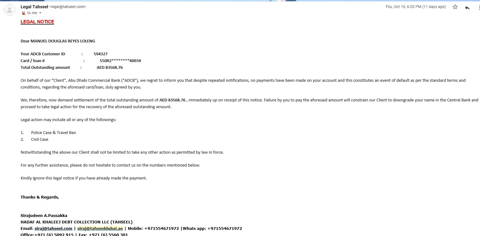 I lost my Job since May 2019 and submitted all my documents to ADCB BANK, Bawabat Al Sharq Branch to Ms. Madame Hanan and Informed the officer of the Bank Mr. Mohamad Ali. All Document like Passport, Visa, Certificate of Termination and I signed 3 times every month the Involuntary Loss of Employment Claim Form and everthing was accepted by the bank. They told it will be submitted to collection department. This loan was under ADCB CID No. 594327
