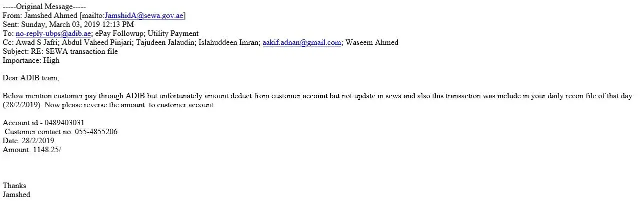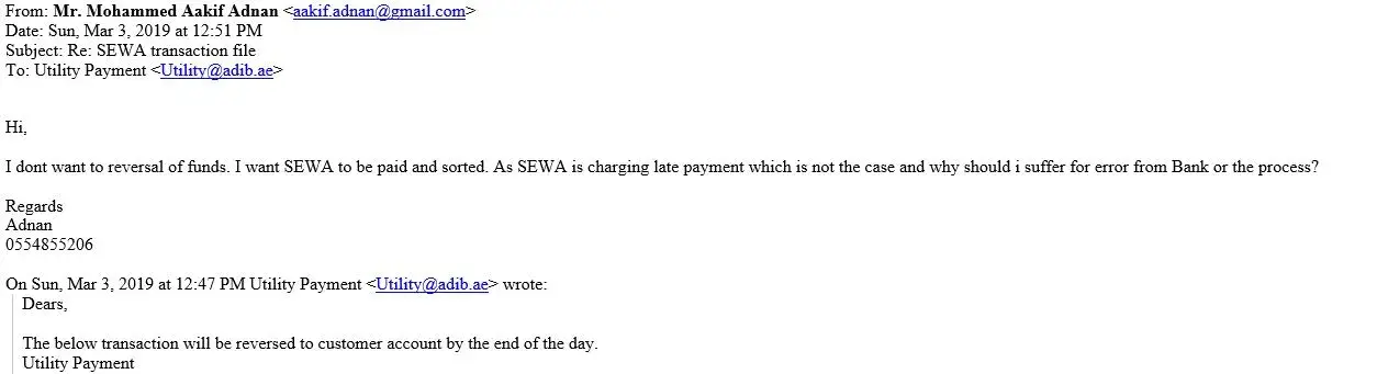 Now SEWA is charging me late payment penalty on top of previous month payment which ADIB has taken. this is very bad experience and my family is suffering due to poor service from ADIB.