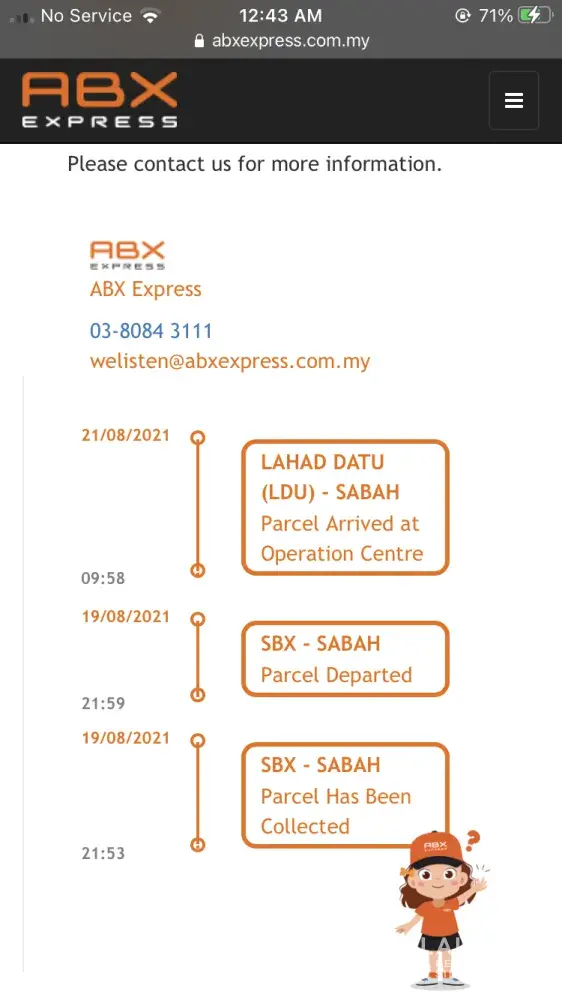 Since 13/08/2021 until today my parcel tracking not moving.. what kind of service is this.? Since Shopee start using ABX, I'm very2 frustrated as ABX take 5-7 days process before the parcel is out for delivery, when the status is out for delivery, it will take another 3-4 days to reach me.. up to 10-12 days in total from the parcel arrive to Sabah from china the delivered to me.. worst courier ever.. Please learn from JNT, I really happy when JNT pick up my parcel as I know I will receive my parcel on same day or the next day.. WORST COURIER SERVICE EVER, ABX KOTA KINABALU