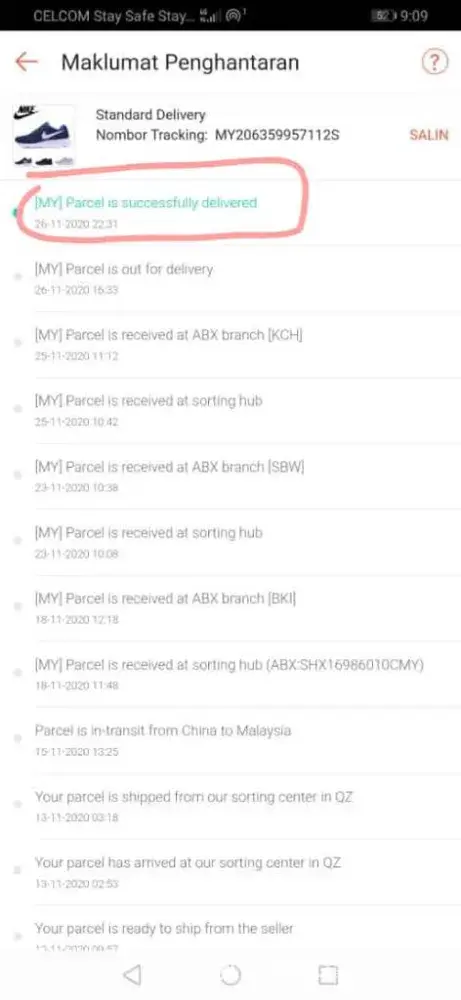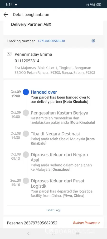 Barang kiriman masih dalam penghantaran (Kota Kinabalu) sejak 9 OCTOBER.