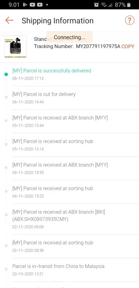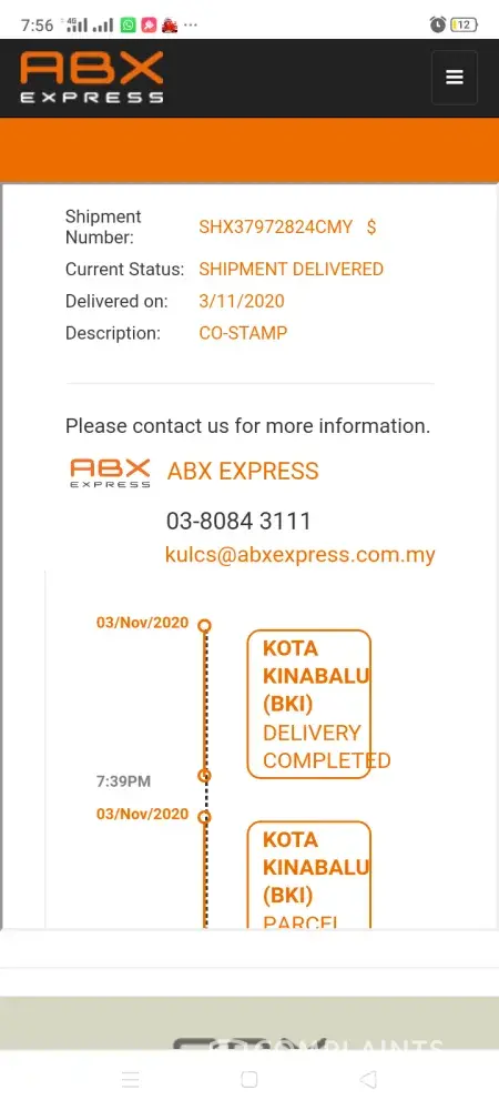 Finally, on 12/11/2020 I visited UTS Logistics Sdn Bhd in Jalan Kolombong to self-collect my parcel. Was told that the parcel allegedly was already delivered to ABX Tamparuli since last week (but they never updated it in the tracking system). I then called ABX Tamparuli to track my parcel. I was told that ABX Tamparuli never received my parcel.