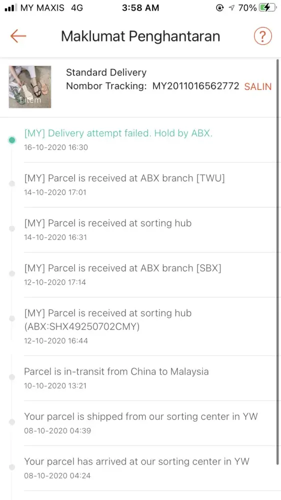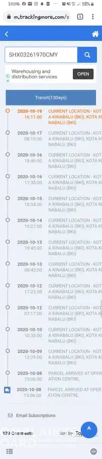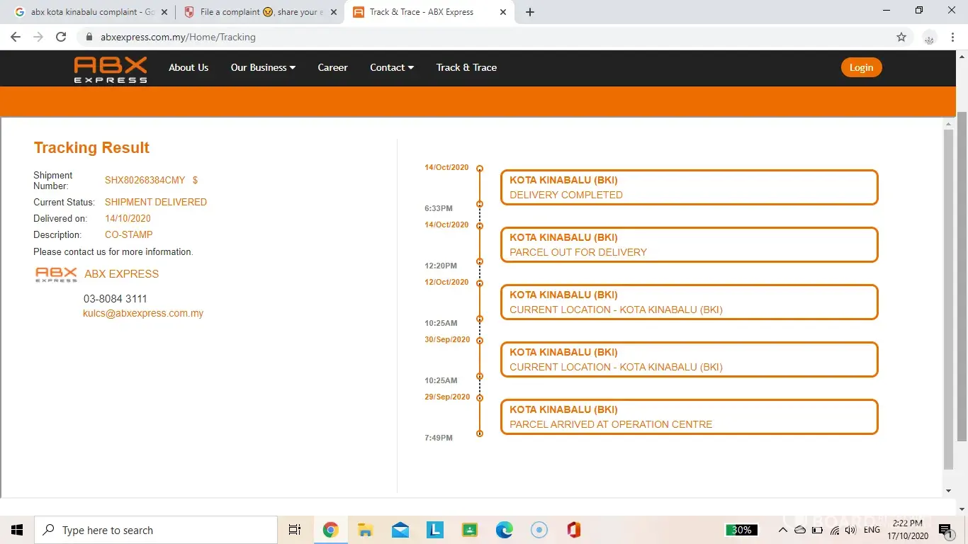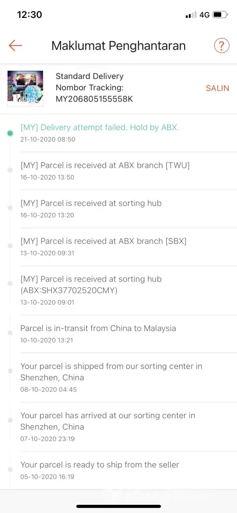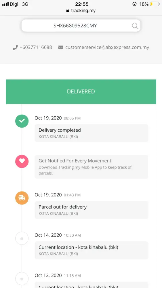 I do understand due to this pandemic covid 19 might have a delay but what make me so unhappy is when the parcel already received at the Kota Kinabalu sabah warehouse since 12/10/2020 which I may highlight to you its been past a week, but the abx still do not have any attempt to make out for delivery to my address. To my concern, why is that. Plus why did they only bothers to update curent location everyday in kota kinabalu? I may not be the pro in how you handling the parcel but usually on my past experience using abx, once received on 12/10/2020, they will attempt to make the delivery asap. Now, please make a update as im worried my parcel already damage (I do hope so much this do not happen) or my parcel are lost.