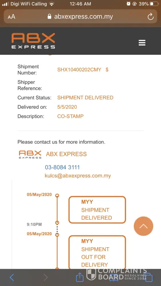 As of today, I check my tracking no on abx website it is suppose to be out for delivered at 12.30pm. However, when I check again at night around 8.30pm, the status is delivered with co-stamp. It is funny because I didn't received my item but how the status is delivered with co-stamp. When I check the review online against ABX, now I know that they have a poor service since years ago.