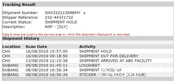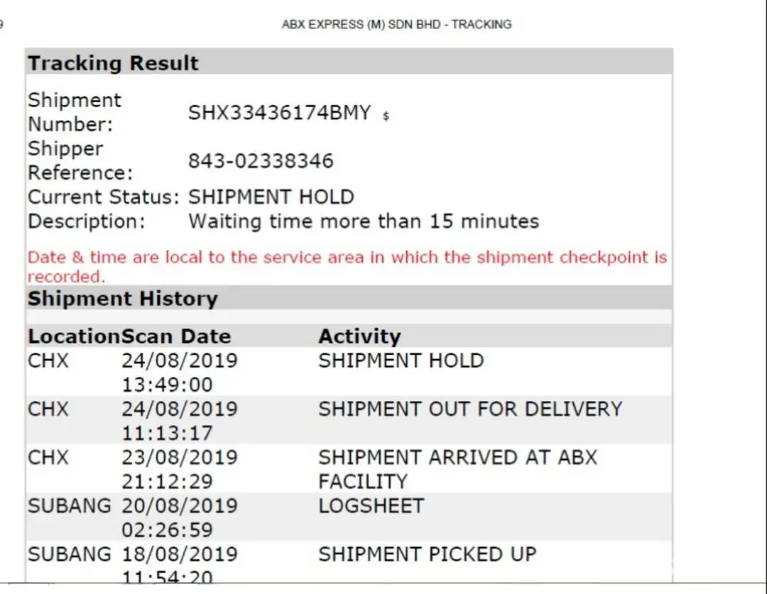 SHX96745222BMY - Called ABX at least 3 times but the parcel status still the same with them since 6 August 2019. Asked to return call or when to deliver my parcel they can't response at all. Parcel from China to M'sia took less than a week but with ABX is already 2 weeks. Can't imagine how this could be happening. ABX, please don't test my patience & your service really SUCKS.