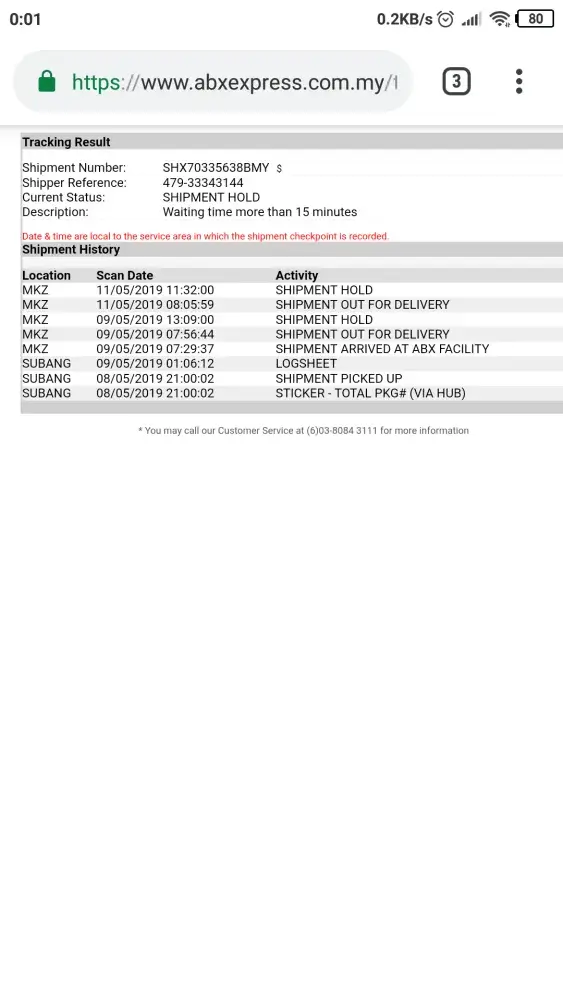 Hello, i dont know whats the problem but the parcel is hold twice. reason code : waiting time more than 15 mins. what that means? i have been called during delivery, but i didnt answered the call or something else? im not aware that there is any unregistered phone number (which is from abx, etc) in my call log. im not sure whats the problem but pls give me explaination. in a meantime, pls help me resolve this issue. below i attach the tracking details. thanks