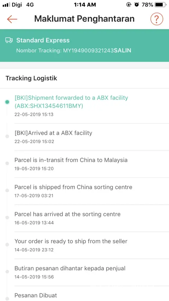 Saya order barang dari Lazada (LZXL0000916171) & Shopee (SHX67848286BMY) dan pesanan saya bertolak dari China dan telah pun sampai di ABX Kota Kinabalu (BKI) pada 22 Mei 2019. Sistem ABX tidak dikemaskini sehingga 27 Mei 2019 dan saya sendiri ikhtiar untuk menghubungi ABX cawangan Sandakan. Pesanan saya dari Lazada & Shopee sudah sampai. Yang menyakitkan hati saya, hanya pesanan Shopee yang saya terima pada 27 Mei 2019, manakala pesanan dari Lazada tidak di hantar. Saya menghubungi semula pada 28 Mei 2019, dan wakil ABX menyatakan akan membuat penghantaran pada hari tersebut. Masih tidak dapat terima, saya menghubungi lagi pada 29 Mei 2019, STILL alasan yang sama, akan di hantar! Please, tolong tingkatkan prestasi ABX ni.. Jangan buat kerja sambil lewa!