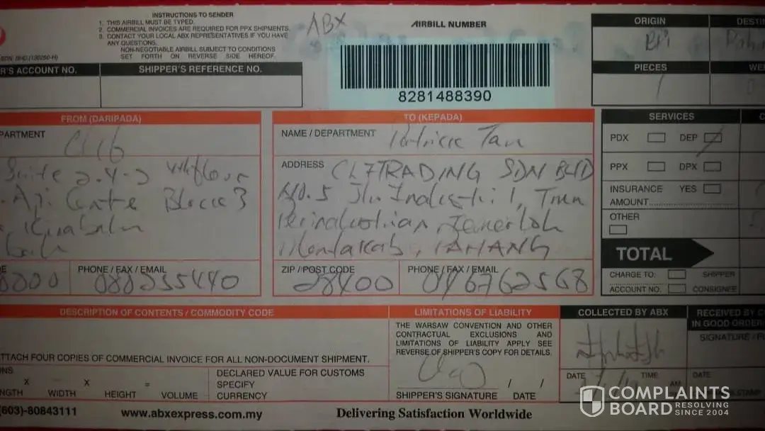 Lastly, I feel very disappointing toward ABX courier service. It is not because of the delay, it is the way of ABX Malaysia handling customers complaint is terrible. They are just trying to avoid any responsibility. I sent e-mail to raise my concern, but no reply at all. I call directly to customers services, they asked me call to the branch that receive my document. I call there then the customers service provide me a cell phone number, asked me to raise my concern there via WhatsApp. Then I sent my concern there, but at the end no response.