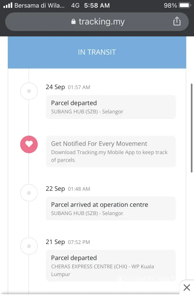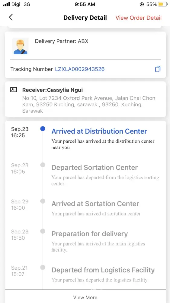 Initially my parcel was processed by a different delivery company which is POSLAJU MALAYSIA. After it arrived at Malaysia from China, the parcel delivery service changed to ABX Express. My parcel had arrived in Kuching on 1st October but it is stuck at the station. The location of the station was also not provided by ABX. The ABX Express tracking number provided is SHP18985560DMY but I couldn't track the parcel using that number.