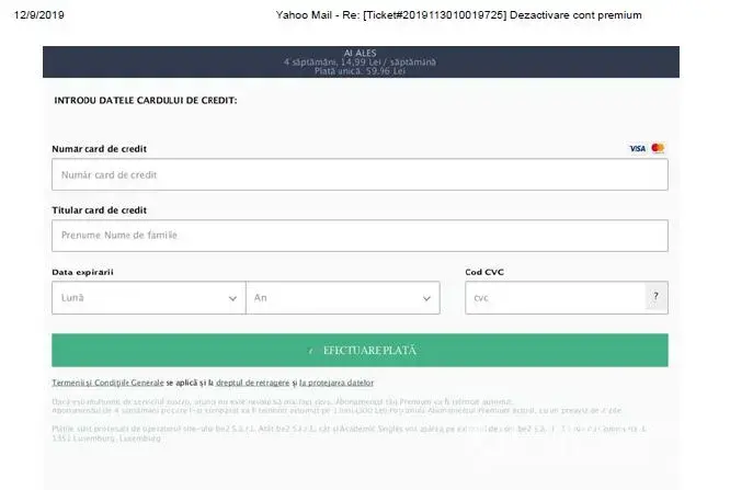 On the 31th of October I made payment online with MasterCard card by completing all the fields required by the respective site (card number, name/surname, expiration date of the card and CVC/CVV code), payment for 4 weeks, at a promotional price... As they claimed... of 59.96 RON