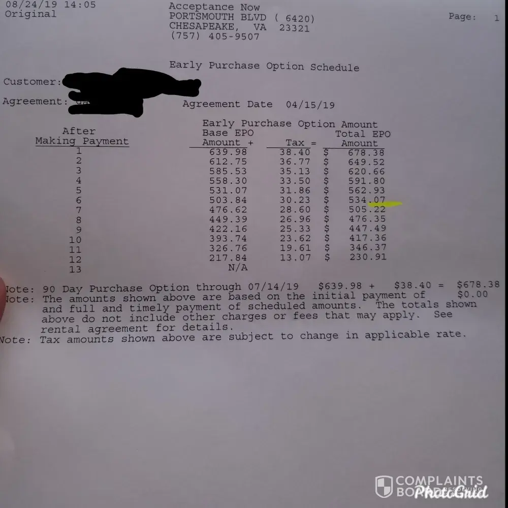 Purchased Sofa leased loveseat I made my payments and as of yesterday went in to make my payment of $250 my balance was $474 so after I made my $250 I was advised that my balance was $610. Contacted customer service and advised that I wanted to pay off the balance from the $474 it's ridiculous how much was added on. Then customer service was calling and every time I would say hello about (3) times no response. My furniture was even delivered until September which had a tiny hole in it. This can really mess up a persons mental health especially all that is going on right now. I reached out to someone named Mitch district manager waiting to hear back. It's like Im paying $1, 500 for a freaking loveseat Acceptance Now is not the route to go it's a complete rip off.