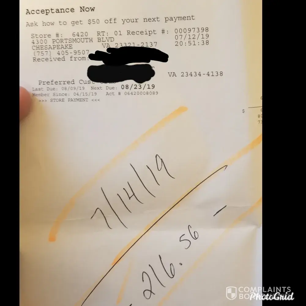That's when they decided to switch my account to monthly payments for $163 a month. So I came in on July 12, 2019 to make a payment with cash, they told me that they cannot take $100 in cash I have to pay if they take my money $68.00.