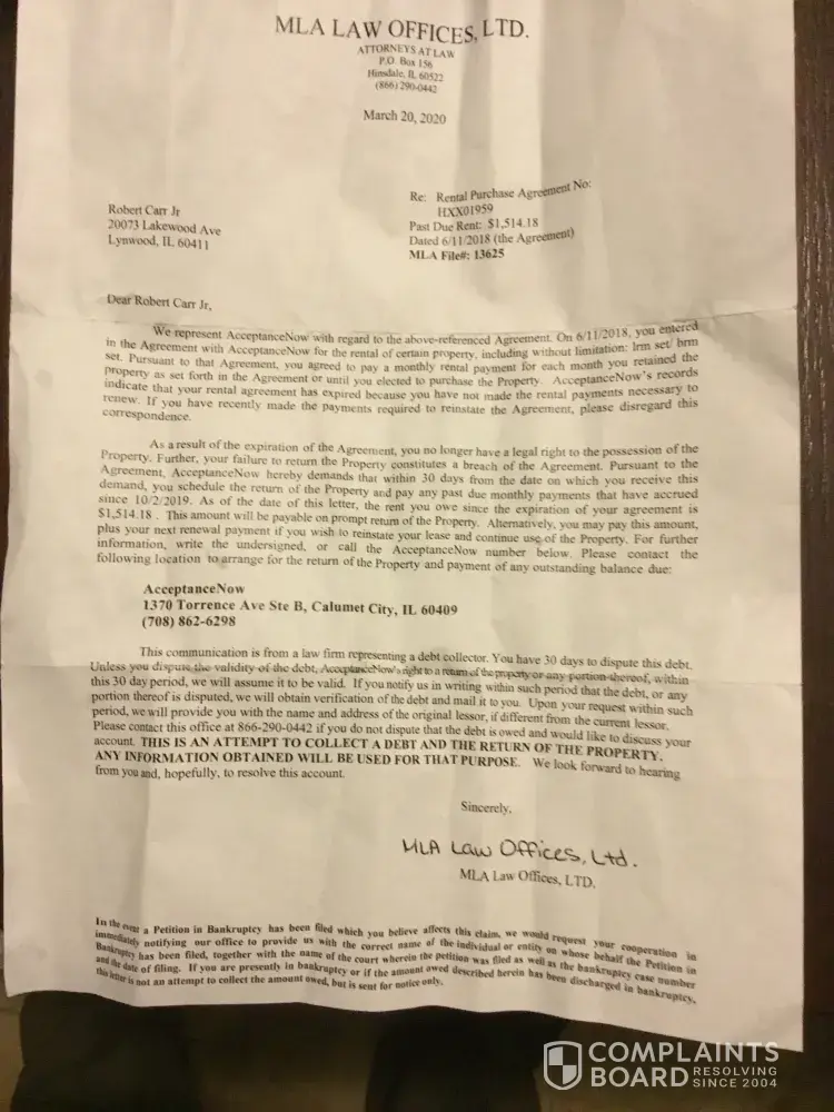 My name is Robert Carr Jr and I have been a customer of Bob's Discount Furniture since June of 2018. The finance option that was given to me then was through Acceptance Now. Currently, I haven't been able to pay past due debts at a reasonable amount of time. On Thursday, March 12, 2020, I called Acceptance Now through Bob's Discount Furniture and spoke with their manager Richard Garcia. I called to set up a payment arrangement to catch up on past due debts that I owed. Unfortunately, the manager stated to me that I was unable to make a payment. Mr. Garcia refused to work with me regarding making any payments. I requested Mr. Garcia send me a letter in writing regarding this issue and he failed to send the requested letter. Next, he offered me a settlement amount of over $900 that I couldn't possibly pay. Mr. Garcia then stated that if I didn't make the settlement payment by March 31st, then I would owe over $1500. Therefore, he left me with no options. Later in the month, I received a letter dated March 20th from the Law Office of MLA Law Offices in Hinsdale, IL. The letter stated that if I did not pay $1514.00 plus the regular monthly payment 30 days from the date of the letter, then the furniture I invested in would be repossessed and I would be sued. Please help me regarding this issue. I am requesting the right to make payments on my account and have the ability to pay off the furniture I purchased.