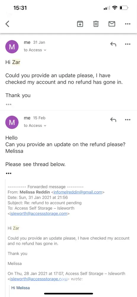 I was and am still due a refund from Isleworth access self storage and have numerous communication calls and emails from the management assuring me the refund will process. It's been going on a fe months now and I have had no refund or returned emails or calls in the last month . Please see screenshots attached at the various attempts.