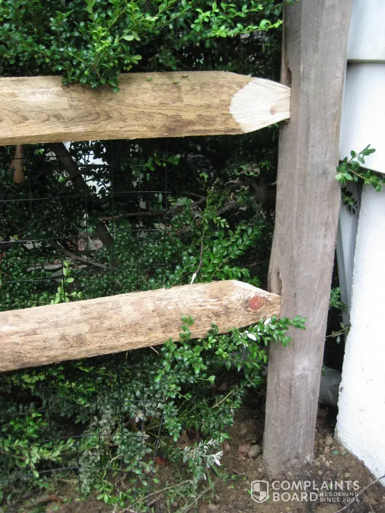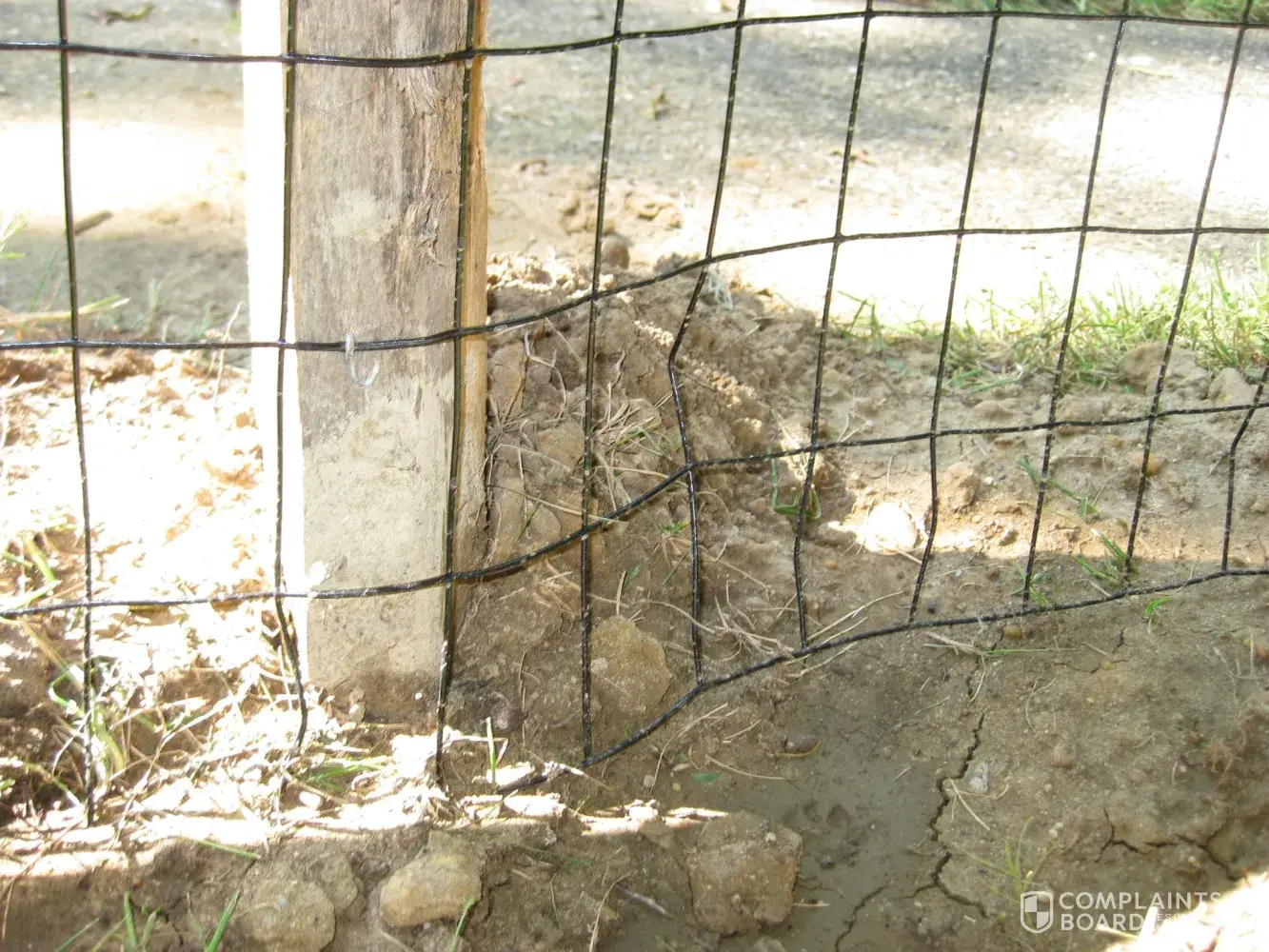 There is about a 10” wide gap between the wire and the post at the side of our house. There is a hedge there. He cut the roll of wire and left the gap. My husband had told them to trim the hedge.