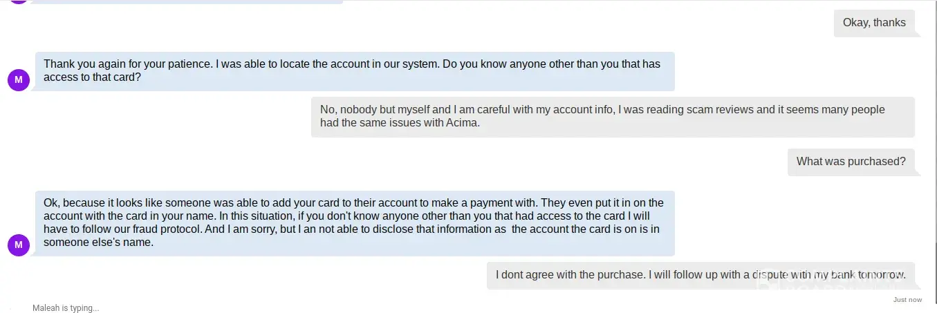 Someone had used my bank account information to open an account at Acima. I called them immediately after receiving the first email from them about my new account which I never applied for. I told them about my bank account info was being compromised and used to open an account with them. They told me that they really scrutinize the application for credit, but sometimes this happens and that I didn’t have to worry about it. Well the emails have continued and now I’m being threatened with my credit being hit for something I never ordered or received. I called into customer service again and now I am being told I need to furnish a police report showing my bank account was fraudulently used. Mind you because of our account being fraudulently used we have had to close our old account which we had for over 20 years and open a new checking account. Since I was treated like some scumbag yesterday by Acima customer service I have already filed my first ever complaint to the BBB. This is only the beginning of what I am going to do if they reflect anything at all period on my credit. Acima is by far the shadiest company going. Never would I do business with a company like this. Never!