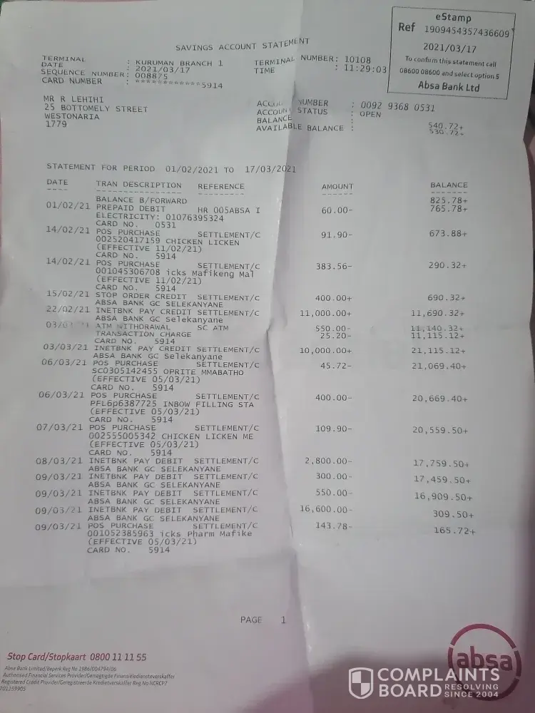 All the tellers were surprised by this and they all explained that I can take anything up to R 41 702 without incurring any debt because Ackermans owes me this amount. I then took items and in January 2021, I receive a statement saying my debt balance is zero confirming further that I do not owe. But strangely in February 2021, the statement came saying I have a debt of R7000 and my credit balance is zero (meaning the 41 702 credit balance disappeared and the things I took in December were now a debt).