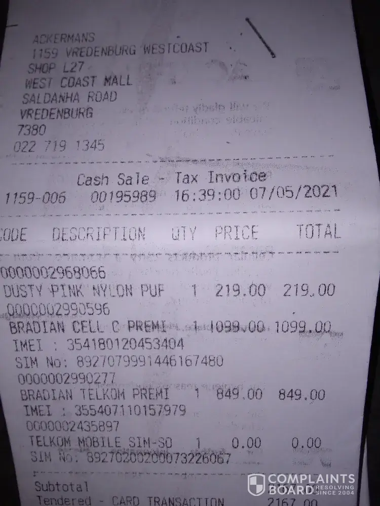 I'm very disappointed about Ackermans I bought phone during lock down last year May 2020 then I returned the phone because it was not charging they keep the phone at Promenade for about 7 weeks then I received the call to pick up phone but unfortunately they didn't fixed the phone they say the problem the pone is having scratche but the problem of the phone is not charging. I bought another phone I keep it for only 2 months its also not charging and I don't want to waist my time to return it also. Now I'm planning to pay Ackermans until I finished balance I'm sick and tired of their stories and closed the account.