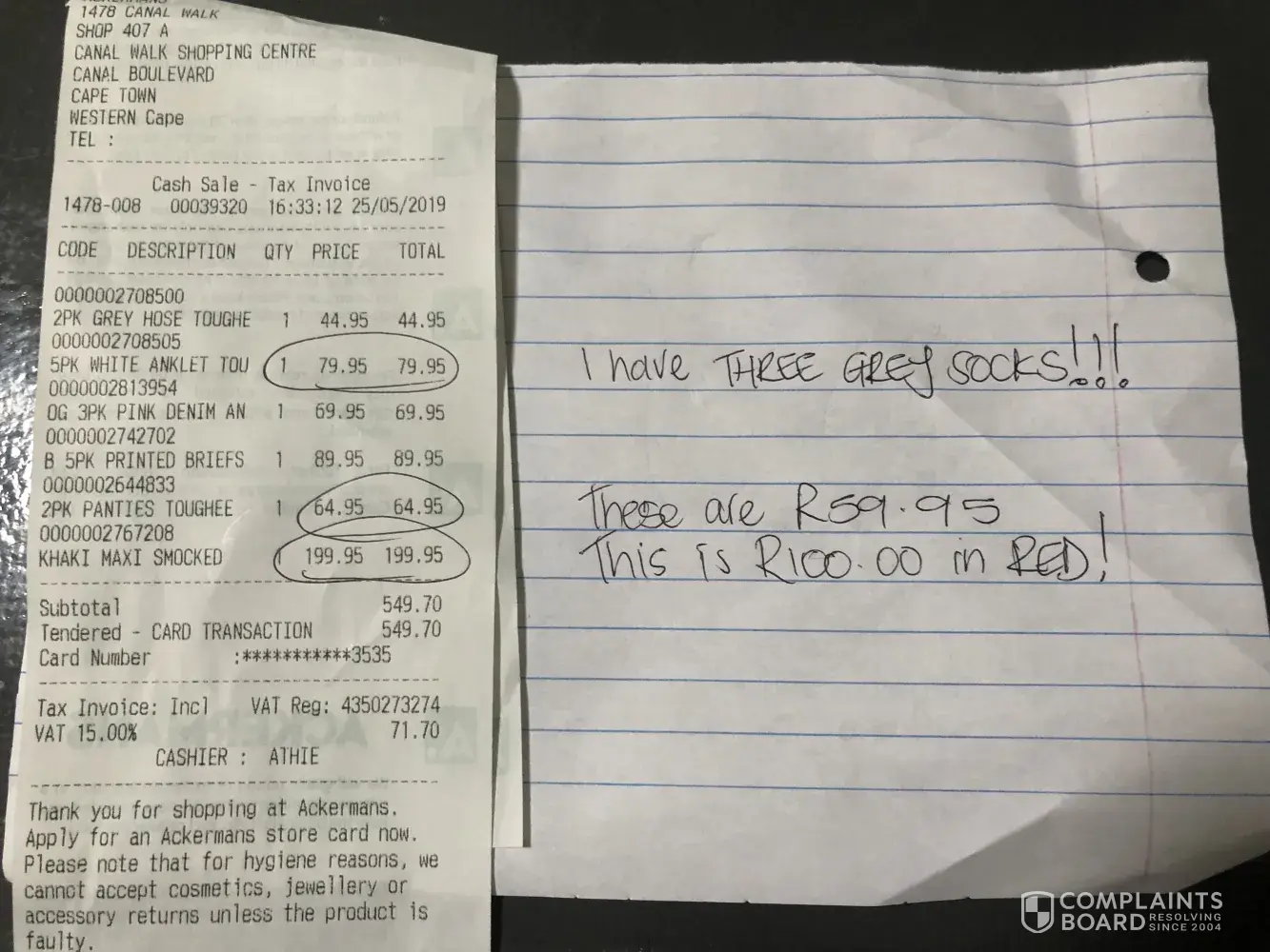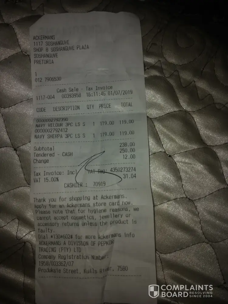 Who's going to pay my petrol money to go back to the store and for my parking and who's going to do something about this? I am not one to complain or go to social media but 1st I was irritated with the cashier and a manager or supervisor was standing behind him also ALSO this is NOT THE FIRST TIME i have been overcharged at Ackermans!
