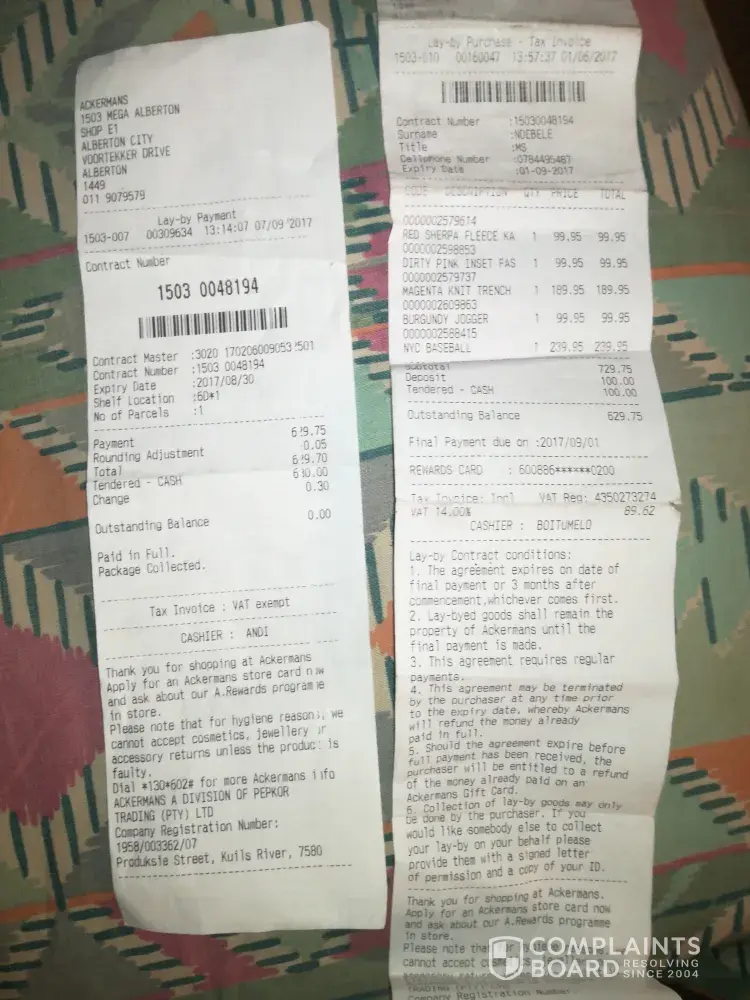 I sent my brother to collect my lay by for me at Ackermans alberton and they took the money gave him a receipt stating that a Layby has been collected but no clothes given to him, cashier name is Andi, and the manager also denied the Layby to be given to my brother, they said he should come back with his I'd book, now hesitant own an I'd book as he's still waiting for it, so must I come back from Kzn!?, because I won't be back anytime soon.the staff assisting had no name tags including the manager.U know my Layby had expired but this is UNFAIR!